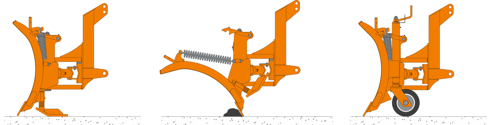 When the cutting edge hits an obstacle such as a gully, the overload mechanism trips and the blade moves up. At the same time its base moves to the rear, floating over the obstacle. Return springs return the blade into working position after the tractor has been halted or the blade raised. The tripping force is set steplessly to suit individual snow and ground conditions and the application at hand.