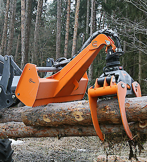 Der Ausleger ist in robuster Kastenbauform gefertigt. An der Unterseite ist er mit einer Zahnleiste ausgestattet, welche zur Abstützung und besseren Lagesicherung des Ladegutes dient. Der hochwertige Endlosrotator ist mittels eines groß dimensionierten Kreuzgelenks am Ausleger angebracht. Die Holzzange wird über eine widerstandsfähige Flanschaufnahme am Rotator befestigt. Dadurch ist eine stabile Verbindung mit niedriger Bauhöhe gewährleistet.